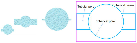 The spherical–tubular model is a useful tool to approximate the complex pore structures embedded in real reservoir rocks. This model is based on the idea that rock pores can be approximated as a combination of spherical pores (the pore part) and tubular pores (the throat part) [36]. The different matching ways between spherical pores and tubular pores represent the different types of pore structures. The model assumes that pores are sorted by their volume size and that each group contains a set of spherical–tubular models with identical shapes. The spherical–tubular models in different groups have similar shapes, but their different radii of the tubular pore and spherical pore exhibit different configurations, which represent the different numerical relationships between the radii of the tubular pore and spherical pore (Figure 8). Not only is the spherical–tubular model a perfect representation of the actual pore structures embedded in rocks, but also it provides a useful approximation to understand and better classify the different types of reservoir rock.