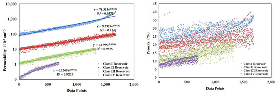 In this study, the reservoirs were divided into four categories based on the reservoir classification presented in Table 1. Both the distributions of porosity and permeability of the four categories in the reservoirs are shown in Figure 9, and the four categories are clearly distinguished. The studies in the paper suggest that the proposed classification is effective in differentiating the storage and flow characteristics of the reservoirs.