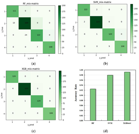 Confusion matrix and accuracy graph. (a) Prediction of confusion matrix by RF; (b) Prediction of confusion matrix by SVM; (c) Prediction of confusion matrix by XGB; (d) Different algorithm accuracy graph.