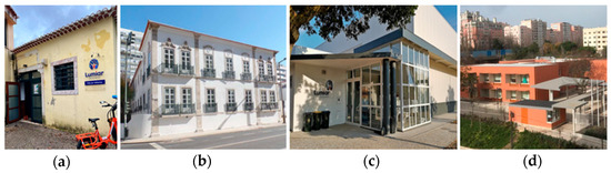 Four buildings intended to install solar PV systems were selected according to the legal viability of utilizing the roof area, suitable conditions for PV generation, and its location inside the neighborhood. The chosen buildings were a community center (a building that serves as a venue for local events and social activities), a local government headquarters (local administrative center), a gymnasium (local multi-sports pavilion for sports practices), and a local primary school, where these buildings will be denoted as Building A, B, C, and D, respectively. Figure 1 presents views of the four selected public buildings. The pilot project is currently in the licensing stage and corresponds to Building A.