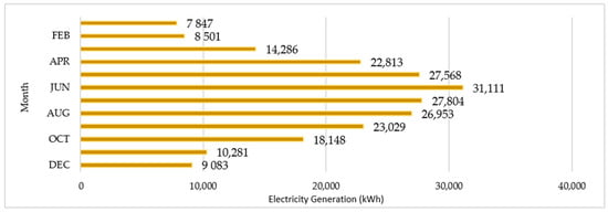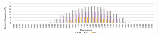 All four systems’ expected generation is 227,424 kWh/year, corresponding to a total installed capacity of 156.5 kWp and 313 solar PV modules. As aforementioned, the total monthly values of PV generation are shown in Figure 2, and the average generation values for the 15 min daily measurements for a typical day of three months (January, March, and December) are presented in Figure 3.