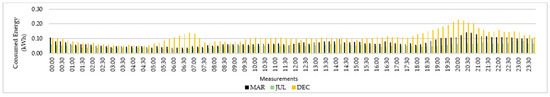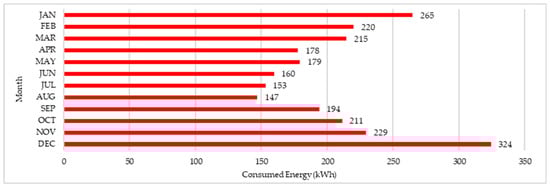 The monthly average consumption values for the average member are shown in Figure 4 and the member consumption profile obtained through the average of eight households that are members of REC Telheiras is presented in Figure 5. As mentioned, this analysis was based on 15 min periods and average consumption days for each month.