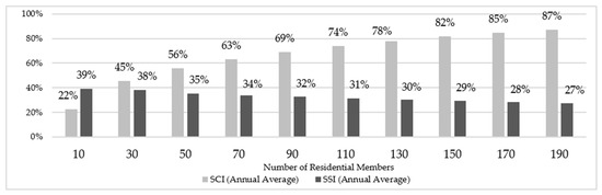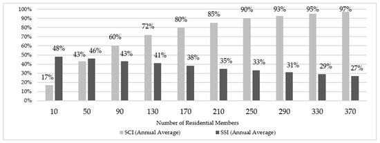 This evaluation for each scenario was completed for ten different numbers of REC members, aiming to provide an overview of the REC size possibilities while varying the values for SCI and SSI. For both scenarios, SCI and SSI were calculated through Equations (1) and (2), respectively.