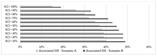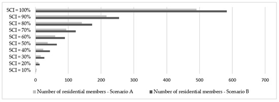 Scenario A and Scenario B were compared according to the obtained values for SCI and SSI for the analyzed number of members in the REC. In Portugal, the net billing scheme usually has a considerably lower tariff for sold surplus energy; the main objective is to obtain high SCI values, meaning that most of the generated energy is being self-consumed or completely avoided injection into the grid (SCI = 100%).