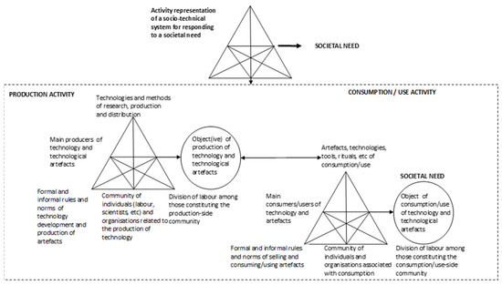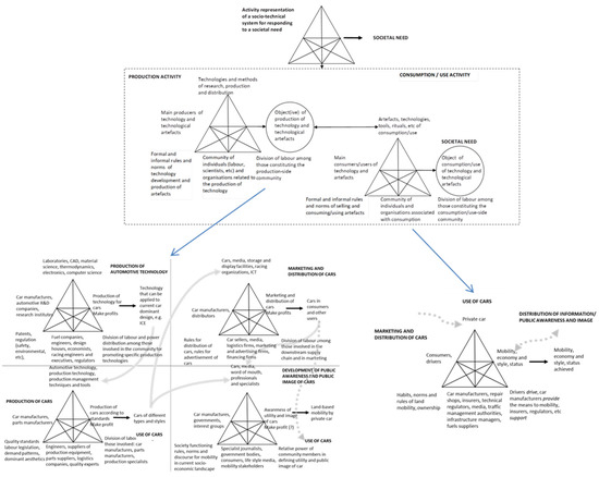 Cultural and historical activity theory (CHAT) [40,41] is a form of activity theory that has already been engaged in the analysis of a diverse range of social and technological phenomena in various societal functions (e.g., entertainment and circular economy [11], education [23], health care [42], international relations [43], communications [44], aerospace [45], services [46], mobility [47]) and cognitive and behavioral issues in different areas, including entrepreneurship [32,48]. Although it was initially proposed as a tool for action research in specific organizational or inter-organizational settings, some of the above uses concern ex post analysis of specific situations for policy making, as well as for theory development. Here, we use the activity construct to represent entire sectors of the economy as socio-technical systems (e.g., the mobility socio-technical system) at different levels of analysis, or specific activities/processes in socio-technical systems (e.g., car production).