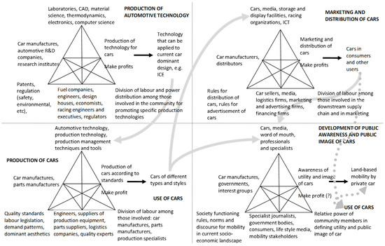 As was indicated in Section 4, each activity system represents prevailing practices at the level of industry/sector. Overall, the five activities of Figure 4 and Figure 5 provide a snapshot of the regime characterizing the automobility sector after the developments described above took place. Hence, the “production of knowledge/technology” activity system encloses the practices/routines that have been developed over time and characterize the production of automotive technology (object). These practices are carried out mainly by the car manufacturers’ research departments and other R&D organizations, and they are mediated by artifacts that have also been developed over time and inscribe their history, such as CAD systems, the language, the culture and the standards of thermodynamics, elements of materials science, etc. The social context in which practices of developing new technology for automotive components and entire vehicles with required characteristics (safety, economy, etc.) are carried out includes the rules, norms and habits for producing this technology (e.g., legislation for safety, environmental performance (e.g., recyclable materials), as well as the community of those involved in the practices of automotive and complementarities technology production (fuels companies, design houses, safety specialists). As was indicated in the brief historical background of the automobility socio-technical system, the object of this activity is primarily determined by leading car manufacturers and is influenced by spillovers from the ICT sector.