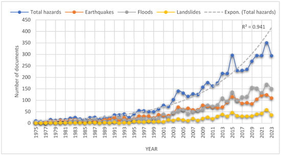 Yearly number of documents in which historical sources were considered by scholars to investigate natural hazards (earthquakes, floods, and landslides). A first significant changing point can be identified at the beginning of the 2000s when the number of documents suddenly increased. Elaboration (FTG) from Scopus data (data downloaded on 28 January 2024). The search was carried out considering all types of Scopus documents.