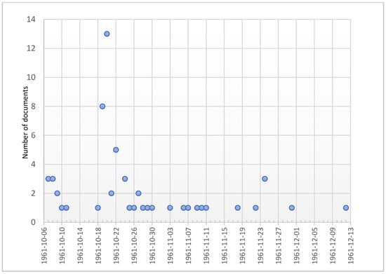 Statistical overview of historical sources consulted (archive documents and newspapers) arranged by date. Some archive documents are not included as they are undated. The sources cover all the period analysed and beyond. Most of the sources refer to the second half of October when some floods occurred.