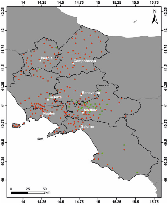 Geographic distribution of 253 municipalities of Campania and Molise involved in the bad weather conditions of autumn 1961. In red colour, the 222 municipalities for which historical sources allowed us to catalogue the effects (see Table 6). In green, the 31 municipalities for which only generic information on effects was available.