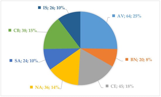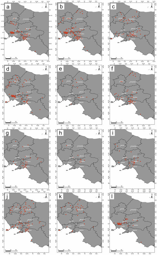 For most of the municipalities (222, ~88%) damaged, historical sources allowed us to know the local effects of raining events and floods. This narrative information made it possible to catalogue the effects into seventeen different categories thus gaining a detailed synoptic picture by regions, provinces, and municipalities (Table 6). However, considering both the statistical differences between “unofficial” and official data and the fact that among the 253 municipalities, 31 have no detailed description of the effects, the data listed in Table 6 could underestimate the real effects for the same categories, with particular attention to the Salerno and Avellino provinces. Figure 9 maps the municipalities involved in the different typologies of effects summarized in Table 6.