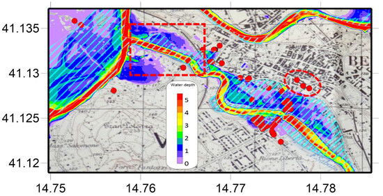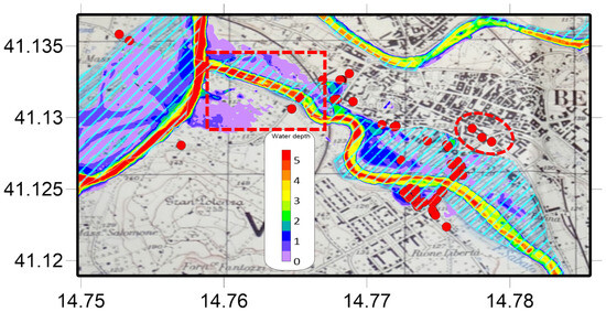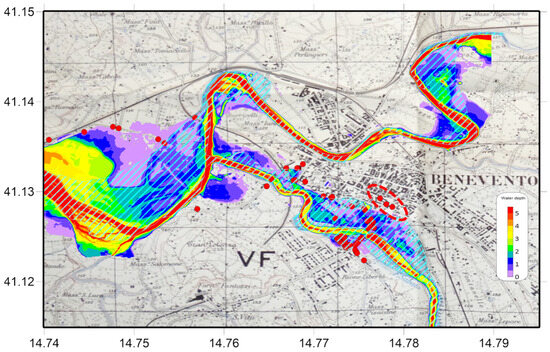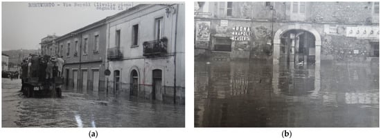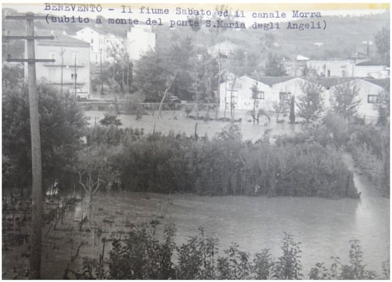 Benevento has been affected by floods of both rivers over time. Historical research carried out by [41,42,43,44,45,46] and the Aree Vulnerate in Italia Project [47], allowed authors to identify more than 40 major floods in the last 14 centuries (Table 1). Due to the geographical positions of the two basin catchments, larger floods in one of the rivers are not synchronous with floods in the other river, so that damages are generally recorded along only one of the two rivers.