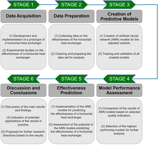The first stage of analysis consisted of experimental studies on the effectiveness of a prototype of the horizontal greywater heat exchanger considering a wide range of input variables covering 32,175 test cases. In the second stage of the research, predictive ANN models were developed on a limited dataset to assess the feasibility of reducing the scope of the experimental studies on the effectiveness of the horizontal GHE. From the set of experimental results, data catalogues were extracted and divided into a training set for teaching the ANN model, a validation set for tuning hyperparameters and a test set for evaluating the predictive model. The logic diagram of the research process is shown in Figure 1.