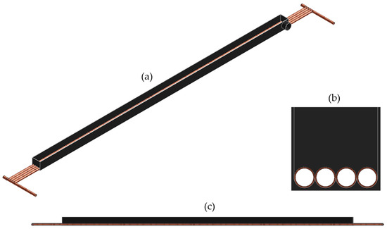 Analyzed horizontal greywater heat exchanger: (a) perspective view; (b) cross-section; (c) longitudinal section.