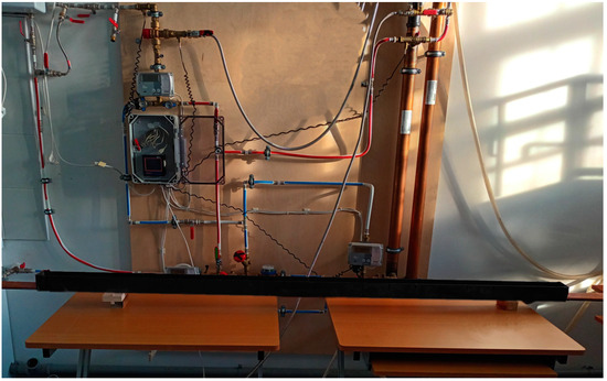 The experimental studies were carried out in a research laboratory located at the Rzeszow University of Technology (Poland). The ambient temperature in the room where the experimental analyses were conducted was continuously monitored and was between 23–25 °C. Three Sharky 473-type ultrasonic flowmeters were used to measure water flow rates in the DHW preparation system. Temperature measurements of water and greywater were carried out using Pt500 resistance temperature sensors. Measurement data obtained during the experimental analyses were recorded using a Simex MultiCon CMC-144 recorder. Figure 3 shows photographic documentation of the test stand.