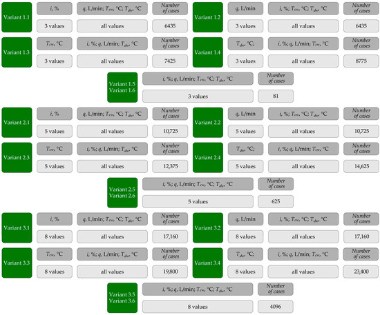 Laboratory tests were carried out starting from the lowest values of the input parameters (i, q, Tdw). The order in which the tests were performed for the cold water temperatures adopted in the test plan depended on the prevailing weather conditions. In the months from November to March, the tests were carried out for cold water temperatures (Tcw) ranging from 8 °C to 16 °C, and in the spring and summer months for values ranging from 17 °C to 20 °C. The research required stabilization of parameter Tcw. Depending on the water consumption in the internal water supply system, the stabilization time of this parameter ranged from a few seconds to approximately 3 min.