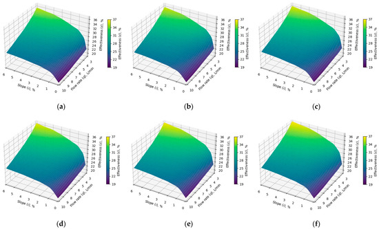 Effectiveness of the tested GHE: (a) Tcw = 20 °C, Tdw = 35 °C (ΔT = 15 °C); (b) Tcw = 18 °C, Tdw = 37 °C (ΔT = 19 °C); (c) Tcw = 15 °C, Tdw = 39 °C (ΔT = 24 °C); (d) Tcw = 13 °C, Tdw = 41 °C (ΔT = 28 °C); (e) Tcw = 10 °C, Tdw = 43 °C (ΔT = 33 °C); (f) Tcw = 8 °C, Tdw = 45 °C (ΔT = 37 °C) (designations as in the text).