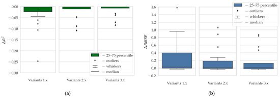Differences in the coefficients values obtained for the additional test set and the dataset involved in the process of generating the artificial neural network models: (a) ∆R2; (b) ∆RMSE (designations as in the text).