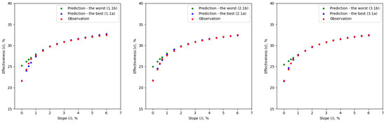 The research also shows that the choice of representative slope values with which the horizontal heat exchanger is installed has a decisive impact on the subsequent prediction accuracy over the full data range. The highest ability to predict the output values in the additional test set was observed when values that were in the lower and middle range of the full dataset were considered when training the ANNs (variant 1.1a, 2.1a and 3.1a). For example, taking only three representative slope values (i) of 0%, 1.5% and 3% (variant 1.1a) resulted in a maximum value of 0.901 percentage point difference between the observed and predicted heat exchanger effectiveness (max(Δε)) for the additional test set (Figure 7). Slightly less satisfactory results were obtained for variants that assumed a uniform distribution of i values in the dataset with the inclusion of outliers. On the other hand, the worst R2 and RMSE values were recorded when only values in the middle and upper range of the dataset were considered when training the ANNs. For example, variant 1.1b showed a maximum difference between observed and predicted GHE effectiveness (max(|Δε|)) of 3.706 percentage points (Figure 7). The relationships obtained are probably due to the hydraulic-energy characteristics of the heat exchanger. The relationship between the slope (i) and the effectiveness of the unit (ε) is curvilinear, and the effect of the slope (i) on the value of the parameter ε is the lower, the higher the value of i. Therefore, not including the lower range of the dataset for parameter i results in a significant overestimation of the network’s prediction in variants 1.1b (3.706 percentage points), 2.1b (3.310 percentage points) and 3.1b (3.136 percentage points). Furthermore, the significant increase in the number of cases from 6435 for variant 1.1b to 17,160 for variant 3.1b only slightly increases the performance of the network to predict the parameter ε over the full range of input data.