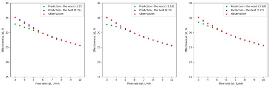 The selection of individual values of the mixed water flow rate (q) also significantly affects the performance of the artificial neural network model. The highest performance is observed for models 1.2a–c, 2.2d and 3.2c, for training of which a uniform distribution of the parameter q values in the dataset was assumed, considering extreme values. The adoption of only three representative values of the parameter q at the levels of 3, 5.5 and 10 L/min (variant 1.2a) made it possible to achieve high performance of the ANN model. This is confirmed by the low values of the maximum difference between the observed and predicted values of the parameter ε at 0.471 percentage points. In contrast, the lowest ANN model performance was obtained for variants 1.2f, 2.2c and 3.2d, in which flow rate (q) values lying in the middle and upper range of the full dataset were taken into account during training. The comparison of the values of the ε parameter observed and predicted by the developed artificial neural networks for selected cases from the additional test set is shown in Figure 8.