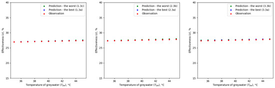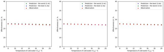For cold water temperature (Tcw) and greywater temperature (Tdw), no significant differences in R2 and RMSE values were observed between the adopted options. In all analyzed cases, there was a very good ability to predict effectiveness values (ε) over the full range of input data. This is probably due to the fact that the relationship between these parameters (Tcw, Tdw) and the effectiveness value (ε) of the greywater heat exchanger is close to a linear relationship. This is also confirmed by other studies [32,41]. In the case of near-linear relationships, artificial neural networks may have greater ability to extrapolate because the pattern they must learn to recognize and reproduce is relatively simple. In such a situation, the model has less risk of overfitting, which means that it generalizes better to unknown data, including those outside the range of the training data. Although the simplicity of the model may facilitate extrapolation, there is still a risk that predictions outside the range of the data will be less accurate. A comparison of the observed and predicted effectiveness values of the GHE for the selected case of an additional test dataset is shown for the Tdw in Figure 9 and for the Tcw in Figure 10.