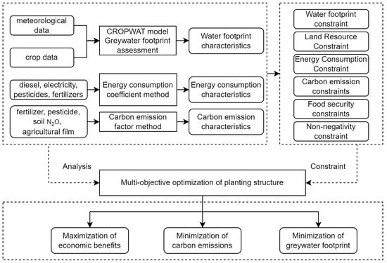 This article’s model for optimizing agricultural planting structure is based on an accounting of the water footprint, energy consumption, and carbon emissions in crop production. Using multi-factor constraints as the starting point, the model focuses on selecting economic and environmental indicators as targets. According to the research results, this paper analyzes the composition of the water footprint and energy consumption for major crops in Jiangsu Province. It explores the spatiotemporal characteristics of agricultural carbon emissions and deduces the optimized planting structure for agriculture; the research technology roadmap is illustrated in Figure 1.