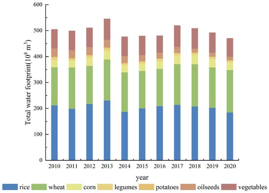 Total water footprint of agricultural crops in Jiangsu province from 2010 to 2020.