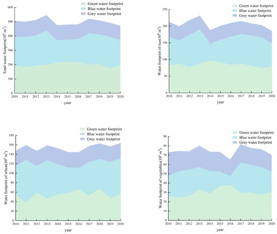 Total water footprint structure and water footprint structures of rice, wheat, and vegetables from 2010 to 2020.