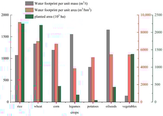 Crop planting area, water footprint per unit mass, and water footprint per unit area.