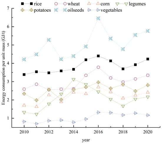Analyzing the composition of energy consumption, as shown in Table 1, diesel and fertilizer energy consumption account for a relatively high proportion in various crops. Jiangsu Province has a large input of agricultural machinery and fertilizer, which are crucial inputs for increasing crop yield. There are significant differences in the proportion of energy consumption for different types of crops. In the unit area energy consumption of rice and vegetables, electricity accounts for 42.02% and 38.26%, respectively. Both crops have a significant demand for irrigation water, requiring a considerable amount of electricity input during the water pumping and irrigation process. The per unit area diesel consumption for legumes is the highest, reflecting Jiangsu Province’s emphasis on the use of and training on legume machinery coupled with the continuous improvement in the level of mechanization in cultivation. Influenced by the growth conditions and planting scale of different crops, the main energy consumption for wheat, corn, potatoes, and oilseeds comes from fertilizer. The energy consumption of pesticides in various crops is not high, indicating that although pesticides are significant contributors to environmental pollution, their energy consumption in crop cultivation is not prominent.