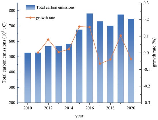 Total agricultural carbon emissions and year-on-year growth rate from 2010 to 2020.