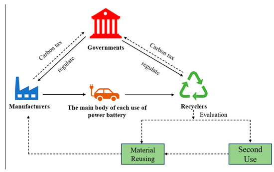 Recycling aged and end-of-service-life batteries from electric vehicles is essential for advancing low-carbon progress and fostering a circular economy, where managing a closed-loop supply chain for power batteries is pivotal in achieving economic and environmental sustainability. To promote ecologically friendly recycling methods, governments must enact green legislation for the disposal of spent power batteries. The decision-making process in environmentally friendly battery recycling involves three primary stakeholders: manufacturers, recyclers, and governments. Governments face a choice between strict regulation and deregulation. Manufacturers and recyclers have the options of ‘participating in low-carbon innovation’ (PI) or ‘not participating in low-carbon innovation’ (NI). Engagement in low-carbon innovation can enhance the reuse efficiency and environmentally responsible treatment of batteries, thereby reducing environmental pollution and resource depletion. Furthermore, manufacturers can avail themselves of low-carbon subsidies from the government by adopting sustainable materials and energy-efficient production technologies. Recyclers can contribute to low-carbon innovation by improving used batteries’ sorting and treatment processes and employing advanced material recovery technologies. Conversely, failing to adopt low-carbon innovation may result in increased environmental pollution and the depletion of metal resources, without the advantage of government subsidies. The recycling process of power batteries is shown in Figure 1.