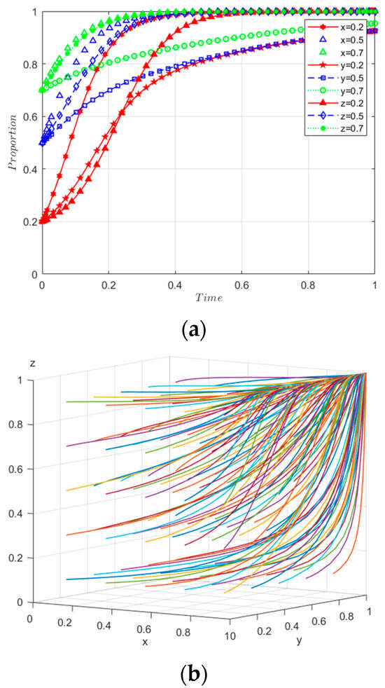 By setting F(x), F(y), and F(z) all to zero, the equilibrium points of the evolutionary game are determined, resulting in eight distinct equilibrium points and one mixed strategy equilibrium within the domain D = {0 ≤ x ≤ 1, 0 ≤ y ≤ 1, 0 ≤ z ≤ 1}. These points are identified as E1(0,0,0), E2(1,0,0), E3(0,1,0), E4(0,0,1), E5(1,0,1), E6(1,1,0), E7(0,1,1), and E8(1,1,1). Weibull established that for evolutionary games involving two or more groups, evolutionarily stable strategies (ESSs) must be strict Nash equilibria and pertain solely to pure strategies [47]. Given that the mixed strategy equilibrium does not meet the criteria for a strict Nash equilibrium, this study focuses exclusively on the pure strategy equilibria. Next, Equation (4) incorporates the pure strategic equilibrium points, which are E1–E8. After determining the eigenvalues of the Jacobian matrix, the outcomes are presented in Table 2.