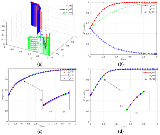 When the cost-sharing coefficients are set at 0.4, 0.6, and 0.8, Figure 10 demonstrates that an increase in co-innovation costs results in a reduced willingness among manufacturers to engage in low-carbon innovations, with all other parameters held constant. Recyclers experience a similar impact. This reduction in willingness is attributable to higher co-innovation costs amplifying both manufacturers’ and recyclers’ resource and financial burdens, thereby diminishing their motivation to undertake low-carbon innovations that necessitate further investment and incur additional costs. Governments, in contrast, remain unaffected by this parameter.
