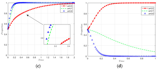 Figure 13 shows that as the carbon tax rate r increases, there is a gradual shift from strict government regulation to no regulation, while manufacturers and recyclers become more likely to engage in low-carbon innovation as r increases. The economic impact of a higher carbon tax rate makes it unnecessary for governments to enforce low-carbon innovation through strict regulations. However, manufacturers and recyclers are incentivised to engage in low-carbon innovation as the carbon tax increases; this conclusion is also well supported by the study of Zheng [51]. This makes reducing carbon emissions an effective way to lower the tax burden and improve competitiveness. Therefore, the introduction of a carbon tax can effectively guide enterprises towards low-carbon innovation and investment, ultimately reducing carbon emissions.