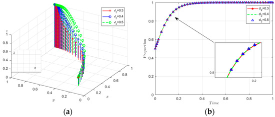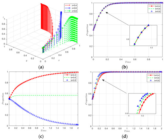 Sensitivity analysis of b. (a) Sensitivity analysis of 3D evolutionary maps. (b) The evolutionary path of x. (c) The evolutionary path of y. (d) The evolutionary path of z.