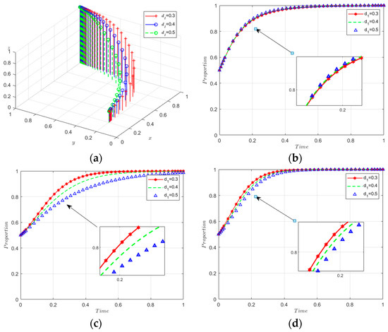 Sensitivity analysis of d1. (a) Sensitivity analysis of 3D evolutionary maps. (b) The evolutionary path of x. (c) The evolutionary path of y. (d) The evolutionary path of z.