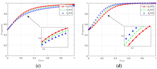In the power battery recycling industry, technological innovation and spillovers between manufacturers and recyclers are particularly critical. The background of technological innovation and spillovers is due to the close technological and economic interactions between manufacturers and recyclers, where the product design and manufacturing process of manufacturers determine the ease and cost of battery recycling, while the innovative technologies of recyclers can improve the recycling efficiency and the material recovery rate, which in turn affects the efficiency and product design of manufacturers. When d1 increases, meaning that the technological spillovers received by the manufacturer from the recycler increase, the manufacturer may become reliant on the recycler’s investment in innovation. This reliance may lead the manufacturer to expect to receive more benefits through the recycler’s innovation, and as a result, the manufacturer may slow down its low-carbon innovation in the short term, as shown in Figure 11. Likewise, when d2 increases, meaning the technological spillovers that recyclers receive from manufacturers increase, recyclers decelerate their pace of low-carbon innovation, as shown in Figure 12.