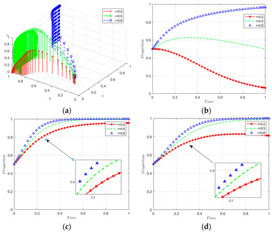 Sensitivity analysis of r. (a) Sensitivity analysis of 3D evolutionary maps. (b) The evolutionary path of x. (c) The evolutionary path of y. (d) The evolutionary path of z.