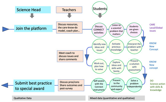 - Students: They go through steps that involve them actively in learning, starting with exploring CONNECT’s activities. They engage in identifying and solving real-world problems with guidance from teachers and input from scientists and their families. The journey ends by presenting their solutions to experts, earning a recognition badge, and applying what they have learned in a practical project, reflecting on the CARE-KNOW-DO approach.