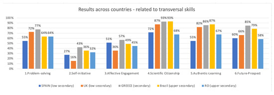 The highest levels of perceived transversal skills were observed in 83% of the Greek students, followed by 80% of the Brazilian students. In Romania and the UK, the percentage was 64%, with that in Spain being slightly lower, at 62%. These findings suggest that the CARE-KNOW-DO framework is effective in supporting underserved students’ positive perceptions of transversal skills based on self-assessment questionnaires of their learning through open-schooling activities.