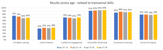 Age-related differences revealed variation in perceptions of transversal skills, with the highest percentages observed in the 10–12 age group at 80% and in the 13–14 age group at 79%. The figure decreased to 55% among 15-to-16-year-olds before experiencing a slight increase to 57% in the 17-to-19-year-old group.