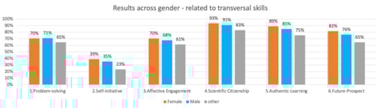 Gender differences showed that 82% of female students had slightly greater perceptions of transversal skills than did 79% of male students. This percentage decreased to 67% among students who identified with a gender other than male or female. As illustrated in Figure 5, the disparity is evident across all skills, with a difference of approximately 45%, except for authentic learning, which stands at 66%.