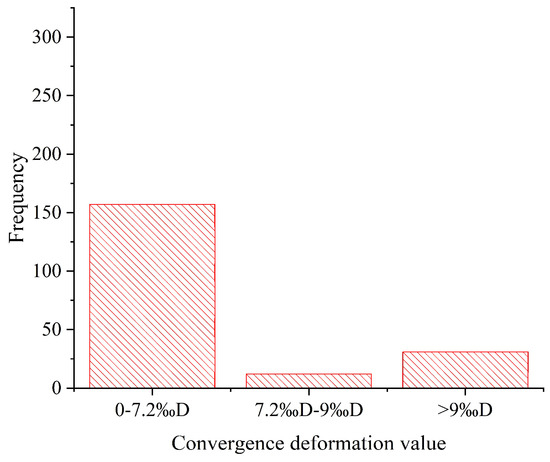 For the shield tunnel with staggered splicing, the early warning value and safety value of convergence deformation are specified in the Specifications for Operational Monitoring of Urban Rail Transit Facilities (GB/T39559.3-2020) [32]. The early warning indicator is 7.2‰ of the tunnel outer diameter, and the safety indicator is 9‰ of the tunnel outer diameter. The over-limit of the convergence deformation value will affect the traffic safety of the tunnel. Taking the data from September 2022 as an example, there are 43 rings of 200-ring tubes where the horizontal diameter reaches the warning limit, 31 rings in which the horizontal diameter exceeds the safety limit, and the rest of them meet the standard requirements, as shown in Figure 3.