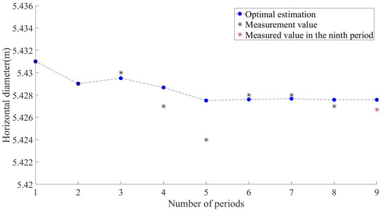 According to Formulas (3)–(7) in Section 2.1, we establish a lateral convergence model for the Kalman subway shield tunnel on the MATLAB platform, input the horizontal diameter of the tunnel as the observation value, and set the initial parameters described in Section 2.2. In this model, the horizontal diameter values of the ninth phase of the tunnel correspond to K = 1–9 time points, respectively. First, based on the observation values and initial parameters at time K = 1, the predicted horizontal diameter and covariance matrix at time K = 2 are calculated. Then, the Kalman gain at time K = 2 is calculated, and the predicted horizontal diameter at time K = 2 is corrected based on the Kalman gain and observation values at time K = 2. The optimal estimate of the horizontal diameter at time K = 2 and the corrected covariance matrix are obtained. The optimal estimate of the horizontal diameter at time K = 2 and the corrected covariance matrix are used to predict the horizontal diameter at time K = 3. Then, the Kalman gain at time K = 3 is calculated, and the horizontal diameter prediction at time K = 3 is corrected based on the Kalman gain and the observed values at time K = 3. The optimal estimate of the horizontal diameter at time K = 3 and the corrected covariance matrix are obtained. By obtaining these, we can iterate through the entire dataset and output the final optimal estimate of the horizontal diameter.