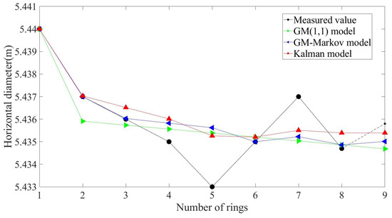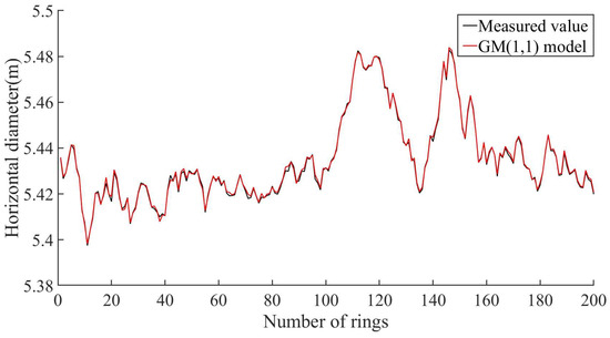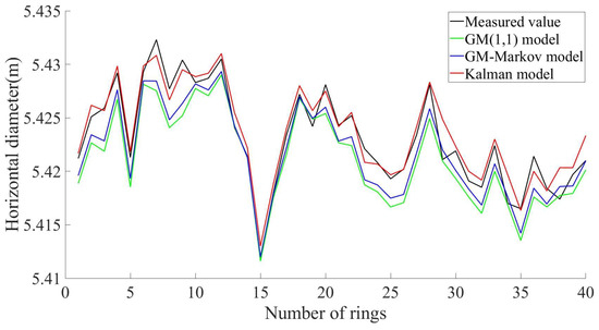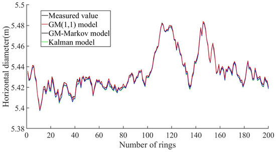 The GM(1,1) model, GM–Markov model, and Kalman model were used to predict the horizontal diameter of the 200-ring segment, and the overall root mean square error (RMSE), normalized root mean square error (NRMSE), the mean absolute percentage error (MAPE), and coefficient of determination R2 are shown in Table 4. The RMSE, NRMSE, and MAPE values of the Kalman model are all smaller than the other two models, indicating that the Kalman model has more accurate prediction results and a higher prediction accuracy. The R2 of the Kalman model is closer to one than the other two models, indicating that the Kalman model fits the data better. Taking into account various indicators, it is proven that the Kalman model has a higher prediction accuracy.