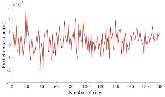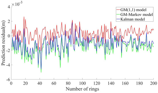 Figure 13 shows the residuals of the prediction results of the three kinds of models for the 200-ring segment. The residuals of the Kalman model are mostly concentrated in the interval of [−0.001, 0.001] m, and the residuals are small, indicating that the Kalman model is stable and has a good prediction effect. The residuals of the GM(1,1) model are distributed in the interval of [−0.005, 0.002] m, and the residuals of some prediction results are more significant, indicating that the prediction result of the GM(1,1) model is unstable and that the prediction effect is general. The residuals of the GM–Markov model are mainly concentrated in the interval of [−0.003, 0.002] m, and a few prediction residuals can reach −0.005 m. The prediction effect is better than the GM(1,1) model but inferior to the Kalman model. In addition, the residuals of the GM(1,1) model and the GM–Markov model are mostly negative, which indicates that the prediction results of the GM(1,1) model and the GM–Markov model are smaller than the measured value.