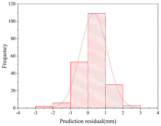The lateral convergence deformation prediction residual of a subway shield tunnel based on the Kalman model is analyzed below to test whether it conforms to a normal distribution. According to the histogram of residual distribution predicted by the Kalman model (Figure 7), there are 162 rings of its residuals which are in the range of [−0.001, 0.001] m, 33 rings in the range of [−0.002, 0.001] ∪ [0.002, 0.001] m, 33 rings in the range of [−0.002, 0.001] m, and only 5 rings in the range of [−0.003, −0.002] ∪ [0.003, 0.002] m; the histogram presents with a bell-shaped plot with a high center and low sides. Through the K–S test of a large sample size, p = 0.057 > 0.05 is obtained, which proves that the residuals conformed to normal distribution, so the Kalman prediction model has a high degree of fit and a strong prediction ability. The normality test results of the data are shown in Table 1. The normal distribution skewness of the residual is −0.128, which is less than 0, the tail on the left side of the curve is longer, and the data on the right side are denser, indicating that the normal distribution is skewed to the left; the kurtosis of the residual is 0.498, which is greater than 0, indicating that the peak state of the normal distribution is steeper. The mean value of the residual normal distribution is positive, indicating that the lateral convergence deformation prediction value of a subway shield tunnel based on the Kalman model is larger than the measured value.