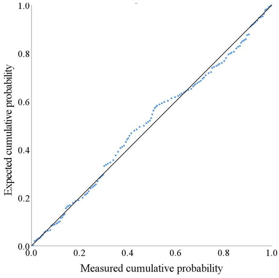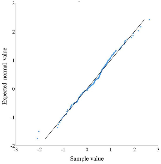 The graphical tests include a histogram, P-P plot, and Q-Q plot. If the histogram presents a “bell-shaped plot with a high center and low sides, and basic symmetry between the left and the right”, the data follow a normal distribution. The probability–probability plot is a graph based on the relationship between the cumulative proportion of variables and the cumulative proportion of the specified distribution, which tests whether the data conform to the specified distribution. When the data conform to the normal distribution, the points in the plot are approximately a straight line. The quantile–quantile plot is a graphical comparison of the probability distribution of two probability distributions in different quantiles. When it is used to test whether the data conform to the normal distribution law, the sample data are taken as the X-axis, and the expected quantile of the normal value data is taken as the Y-axis, in order to generate the scatter plot. The higher the coincidence degree between the scatter point and the straight line, the more the sample data follow a normal distribution.