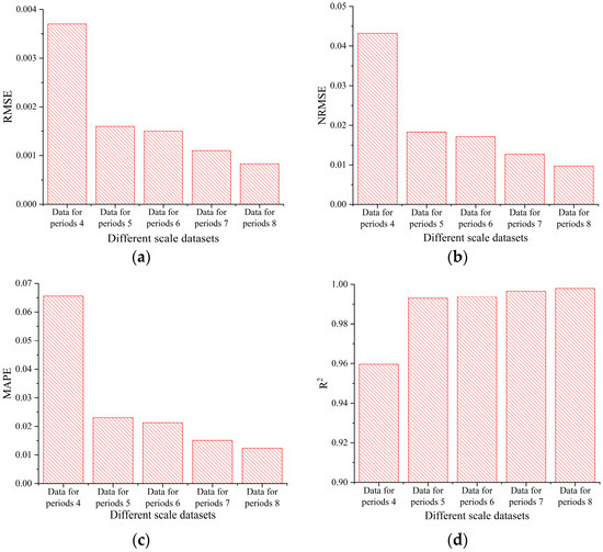 Prediction performance in different scale datasets: (a) RMSE, (b) NRMSE, (c) MAPE, (d) R2.