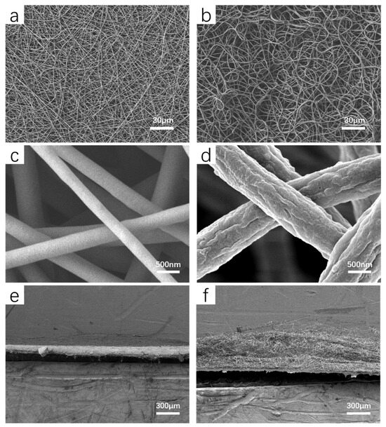 According to Figure 1a, it is evident that PVDF nanofibers fabricated in a low-humidity environment exhibit a uniform distribution in a typical linear morphology, with the fiber surface appearing remarkably smooth at the microscopic level, as depicted in Figure 1c. However, as the humidity exceeds 95RH%, the structure of the fabricated PVDF nanofibers undergoes significant changes. As per Figure 1b, the nanofibers exhibit a 3D curly morphology. Upon comparing Figure 1b with Figure 1d, it becomes apparent that the fiber surface prepared in a high-humidity environment is rougher. Figure 1e,f represent side views of the two samples, respectively. It is observable that the fiber membrane prepared in a low-humidity environment forms a densely packed membrane, while the fiber membrane prepared in an ultra-high-humidity environment assumes a highly voluminous 3D curly structure.